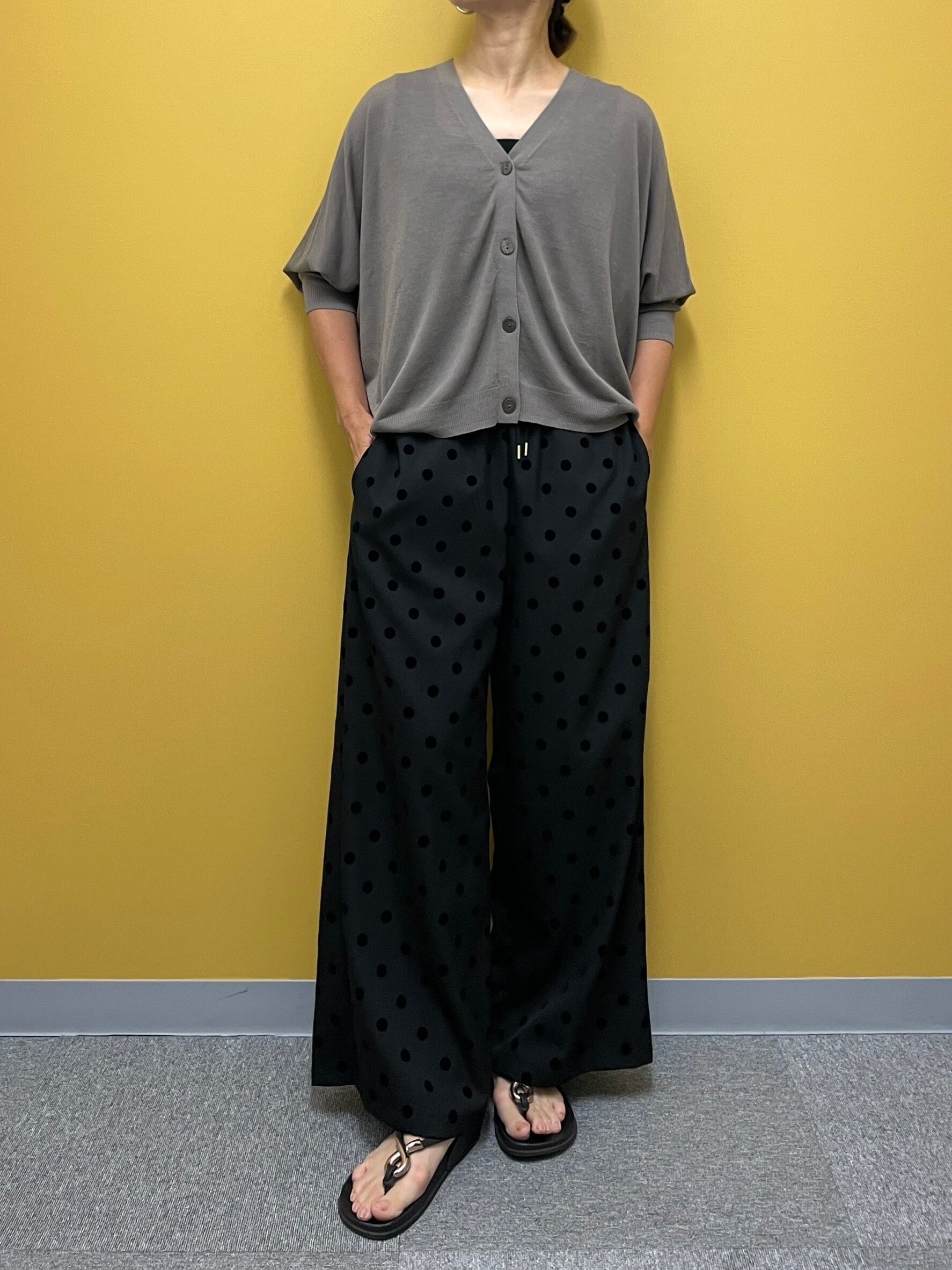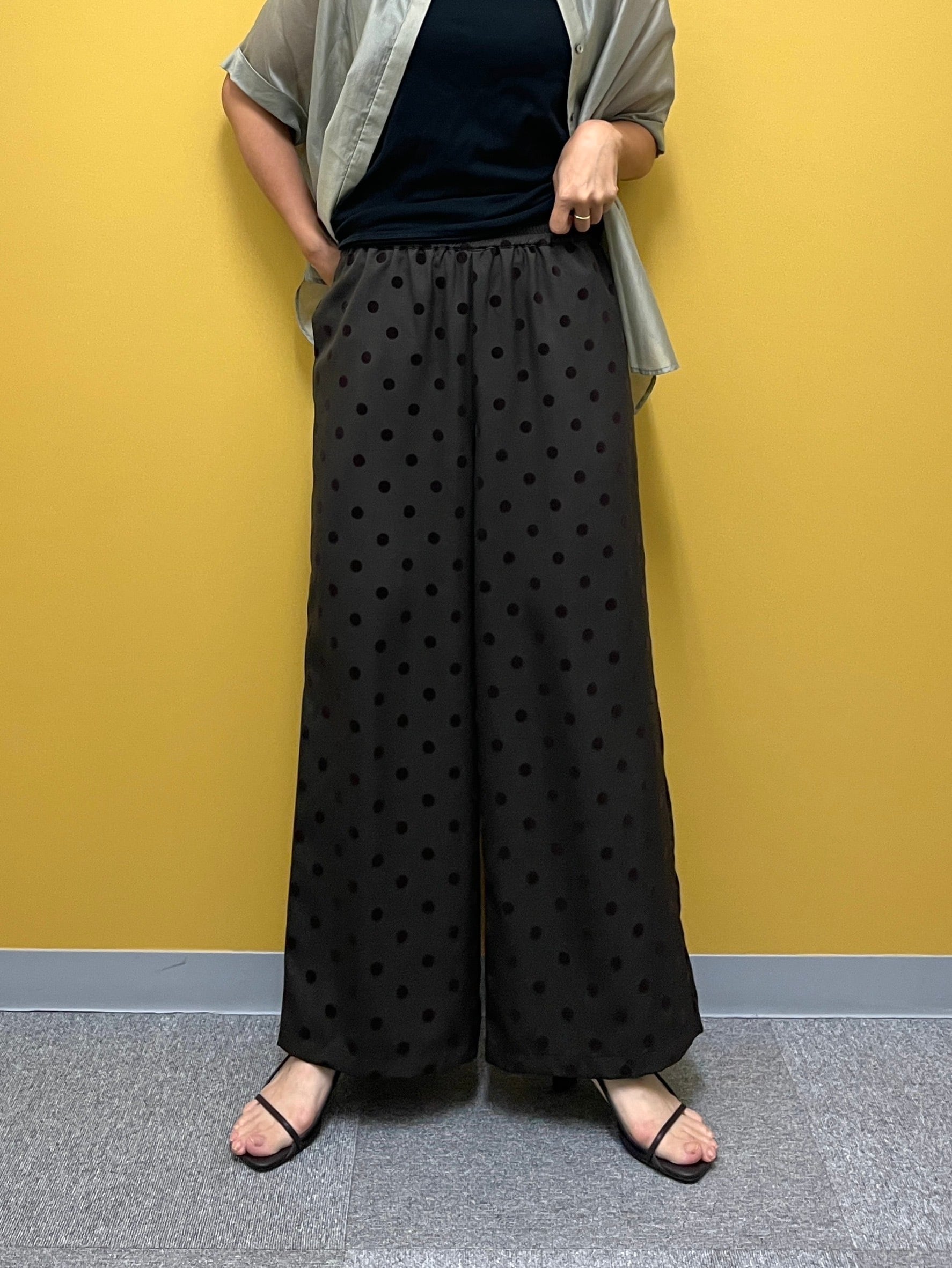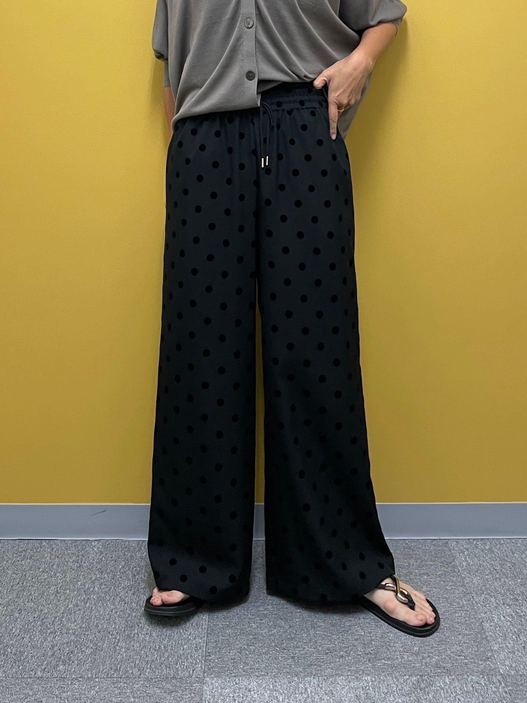 シワになりにくいツイル素材にフロッキードットをのせた、コーデのアクセントになるワイドパンツ。ウエストは総ゴムでかなり楽な履き心地です。