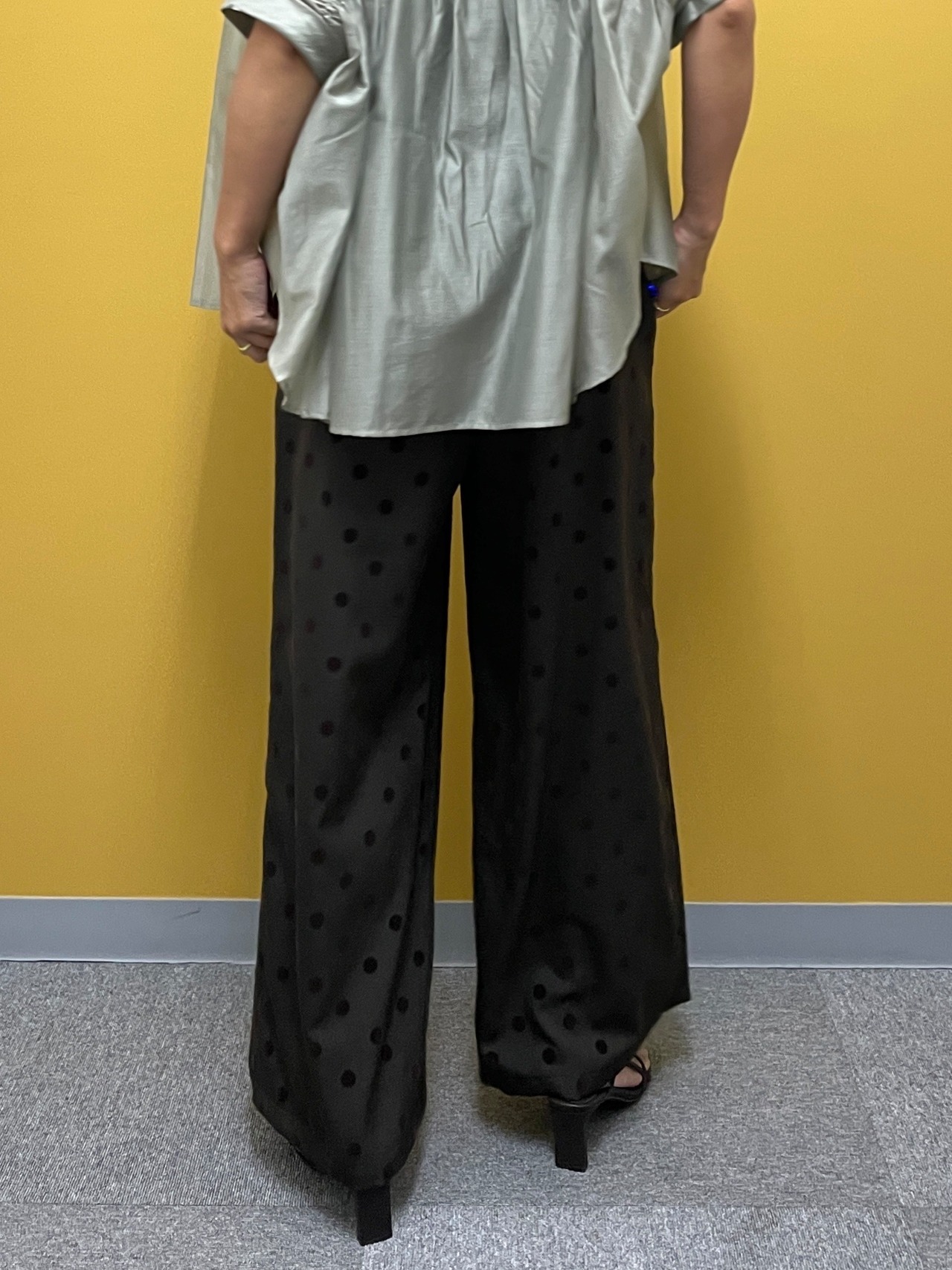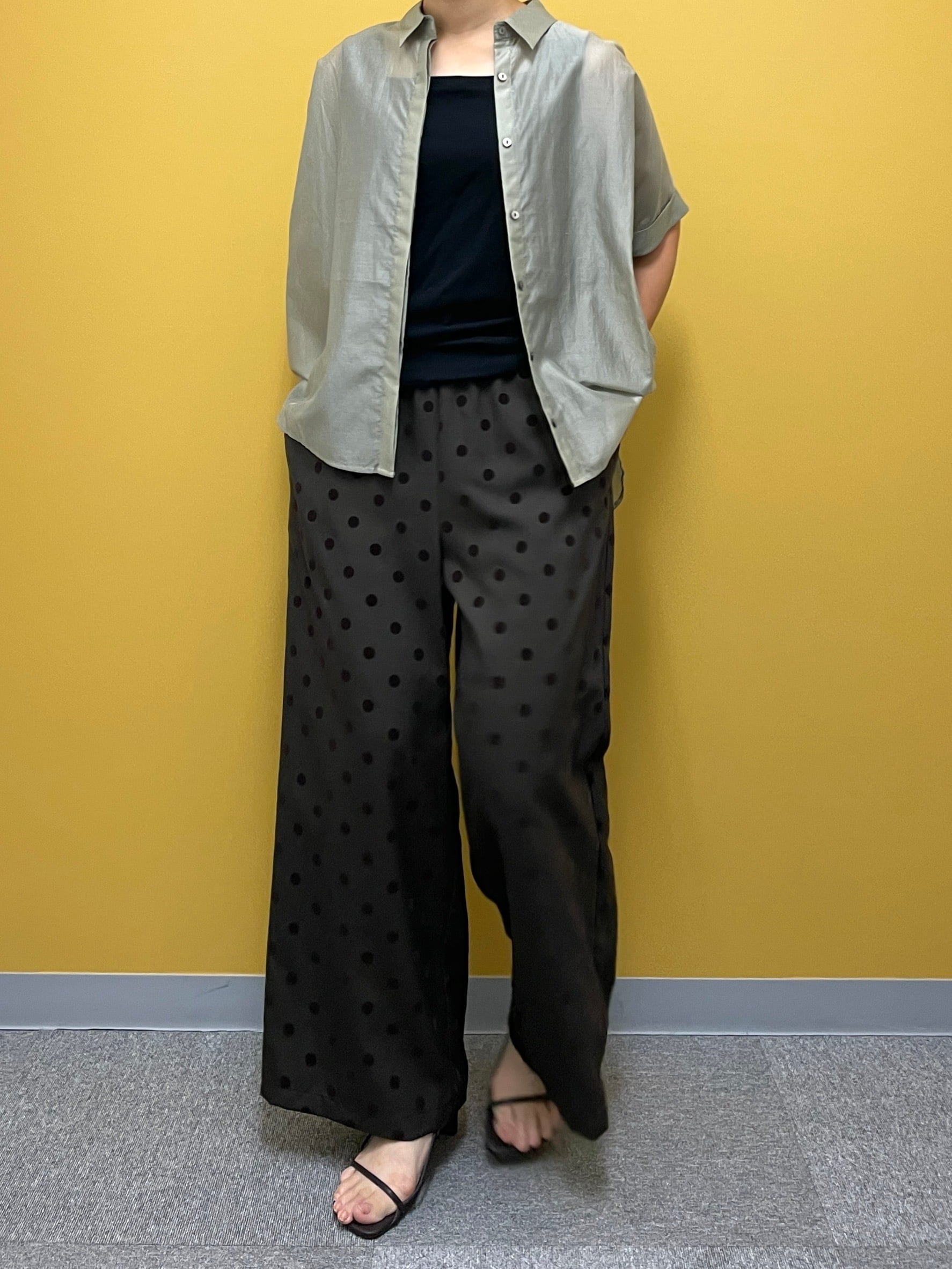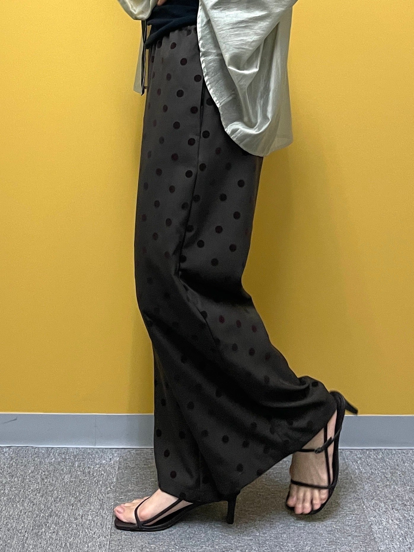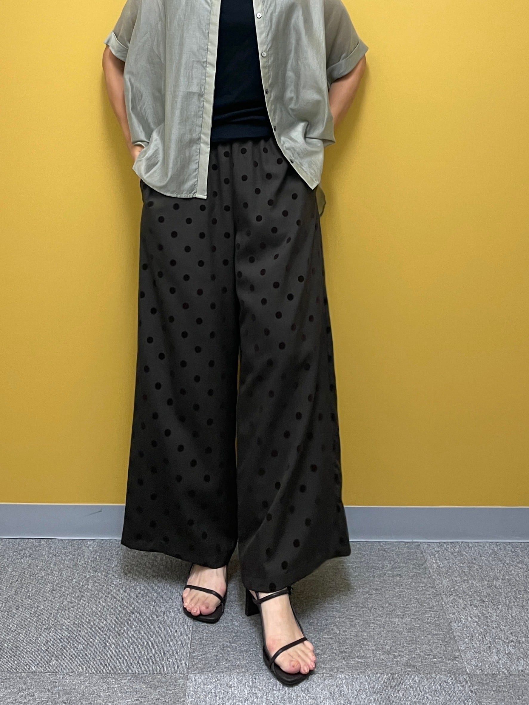 シワになりにくいツイル素材にフロッキードットをのせた、コーデのアクセントになるワイドパンツ。ウエストは総ゴムでかなり楽な履き心地です。