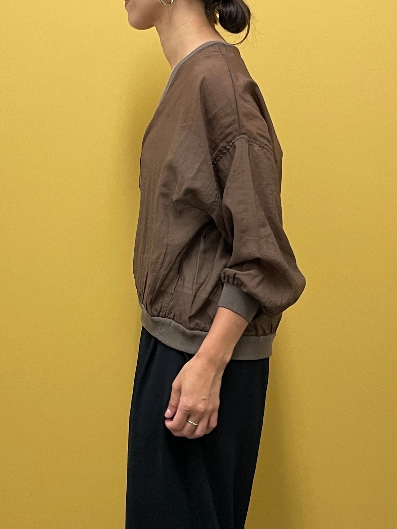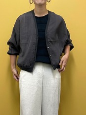 シアー感のある涼しげな生地を使用。ゆったりとしたスリーブにラウンド裾にで動きのある