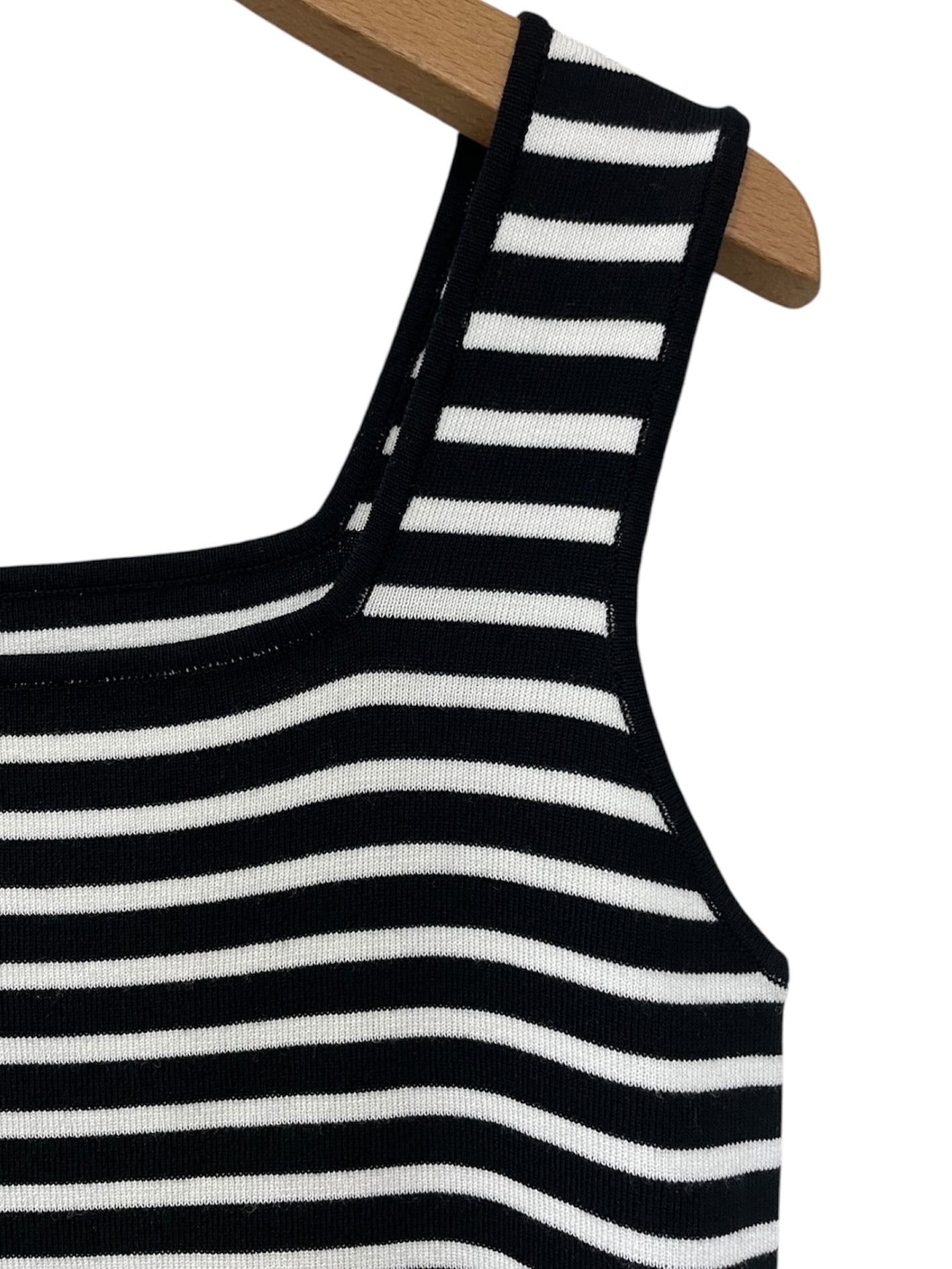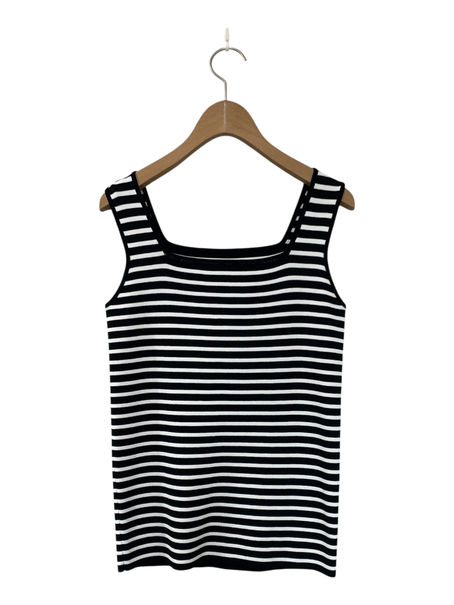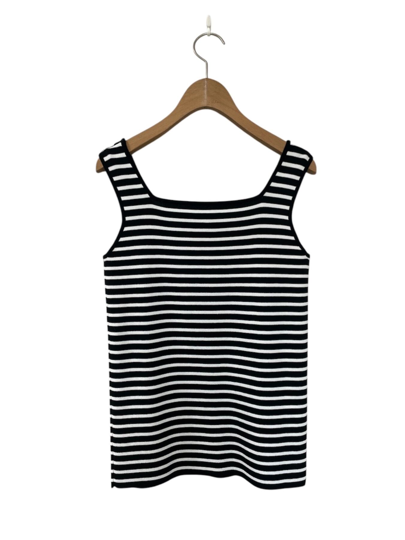 ボーダー柄が特徴的な「ボーダースクエアニットタンク」。柔らかい肌ざわりで、さまざまなスタイルに合わせやすいデザインです。シンプルながらも洗練された印象を与えるため、幅広いシーンで活躍します。